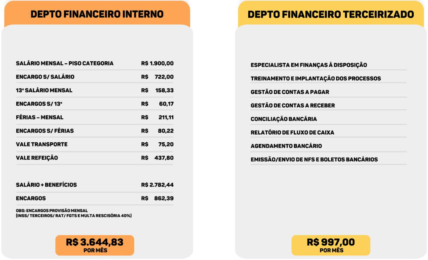 Abaixo demonstramos um comparativo dos custos de departamento financeiro interno x departamento financeiro terceirizado: